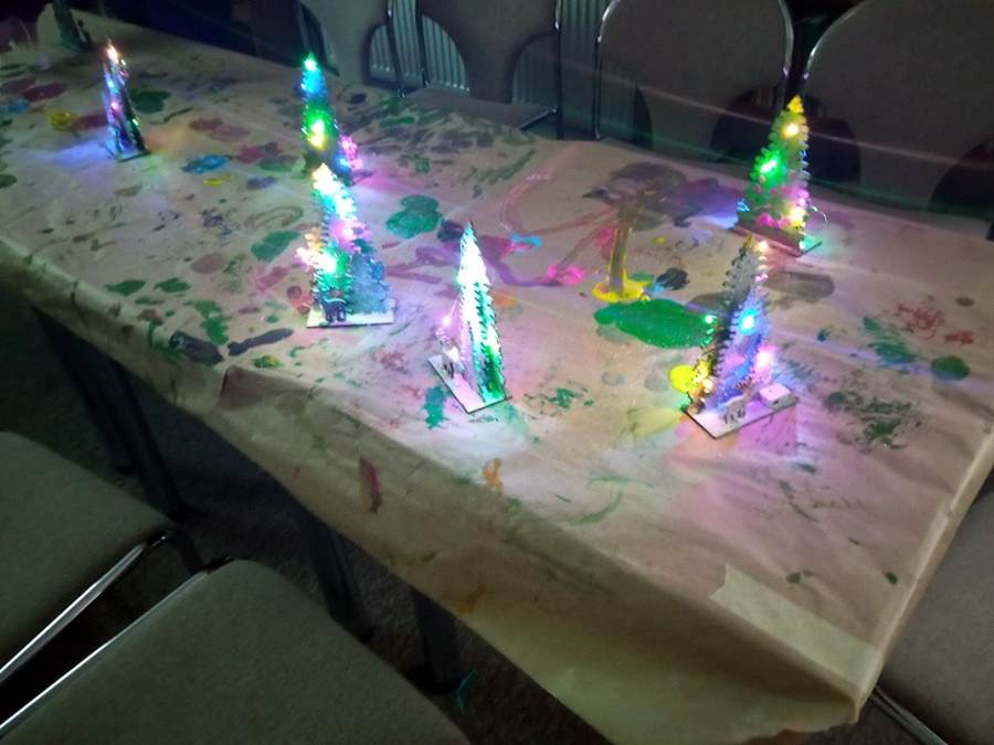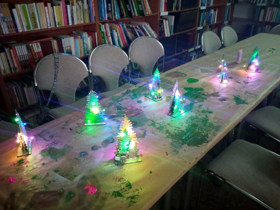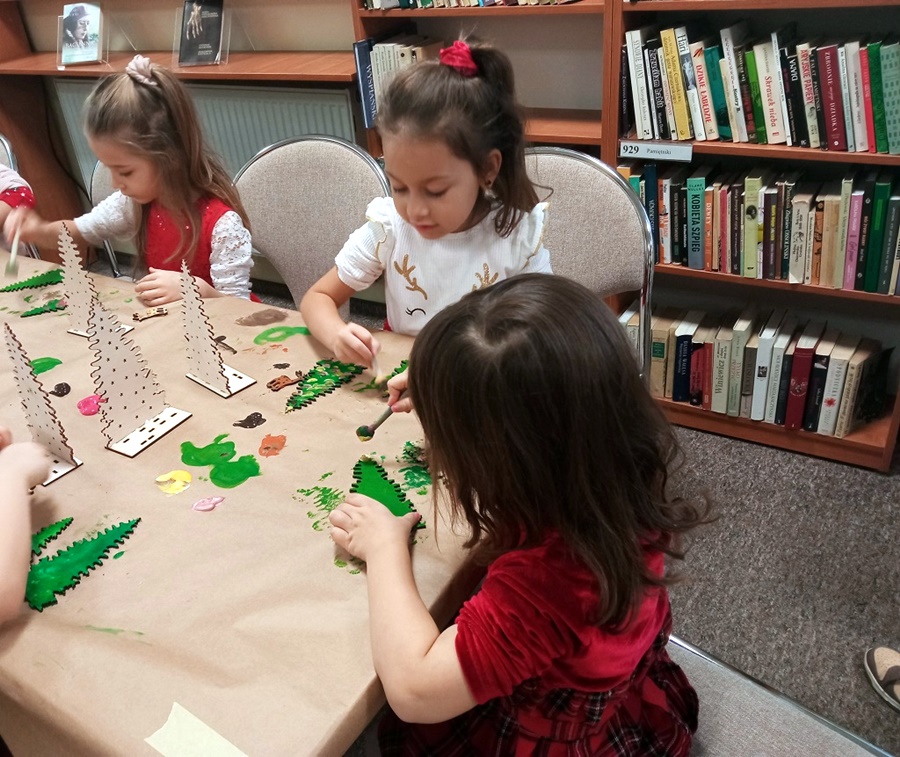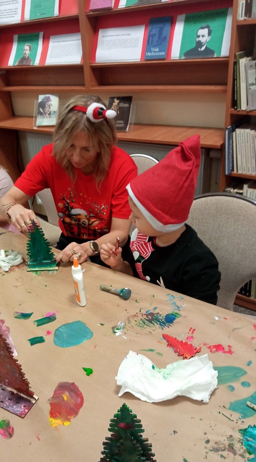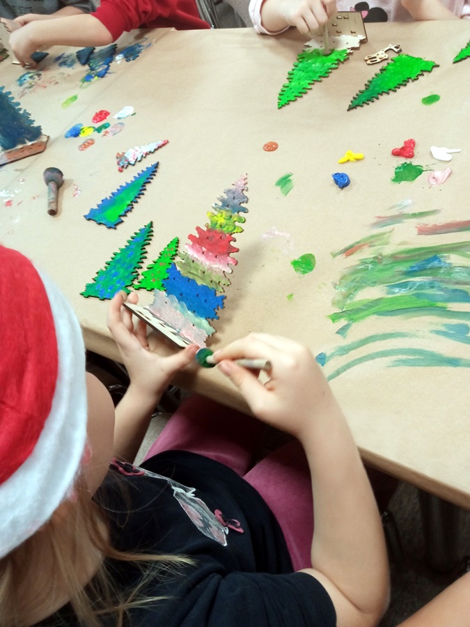 Dzieci miały okazję wykonać świecące choinki oraz dekoracyjne latarenki ze sklejki . Mali artyści z zapałem ozdabiali swoje prace, a każda z nich była jedyna w swoim rodzaju.